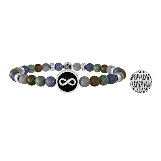 Bracciale elastico in acciaio 316L lucido e satinato, circonferenza 20 cm, con elemento infinito in PVD nero, pietre naturali multicolor. Scritta: FAMILY. Dimensioni: pietre Ø 6 mm, elemento Ø 12 mm.
