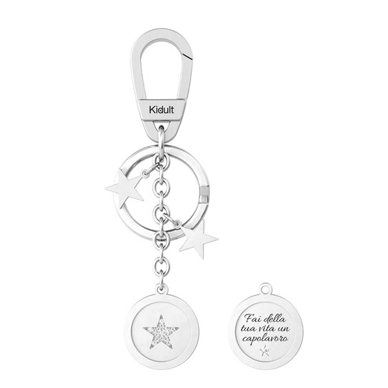 Portachiavi in acciaio 304/316L satinato con ciondolo rotondo con cristalli e stelle. Scritta: Fai della tua vita un capolavoro. Dimensioni: moschettone Ø 35 mm, ciondolo Ø 23 mm