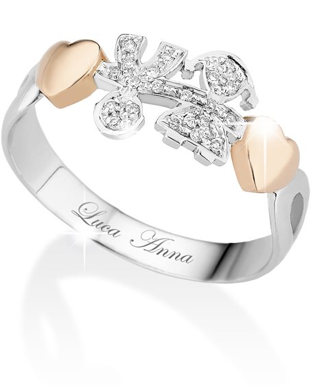 Anello realizzati in oro bianco 18 kt con cuori in oro rosa. Maschietto e femminuccia in pavè di diamanti per un totale di 0.08 punti. Personalizzabile con incisione.