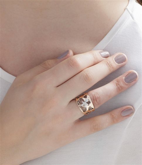 DIVINI Anello a fascia rastremata con gambo in oro bianco e fascia a vista in oro rosa cuori traforati maschietto in oro bianco e pavé di brillanti ct 0,12