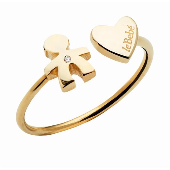La raffinatezza delle piccole cose. Le sagome Bimbo e Bimba in una versione delicata e contemporanea. Anello Bimbo in Oro Giallo 9 Kt con cuore e diamante.
