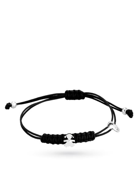 Bracciale in cordino nautico nero con ciondolo sagoma femminuccia in oro bianco con brillante ct.0,003. Le sfere e la targhetta sono in argento 925. Tutti i gioielli della linea le Bebé possono essere personalizzati.