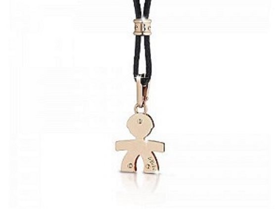 Ciondolo con sagoma maschietto in oro rosa , altezza 1,40 cm. larghezza 1,20 cm., cordino color nero e distanziatore in oro rosa con cuoricino traforato. Tutti i gioielli della linea le Bebé possono essere personalizzati.