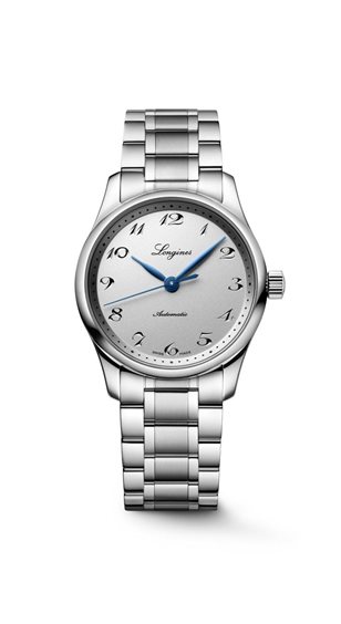 Orologio automatico da donna in acciaio inossidabile, quadrante argento con numeri arabi incisi e lancette blu, solo tempo.