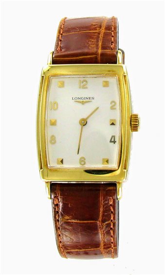 Orologio Longines unisex con cassa rettangolare 26x32,5mm in oro giallo 18kt, movimento a carica manuale Swiss Made, quadrante bianco con indici e lancette dorate, cinturino in coccodrillo lucido marrone chiaro.