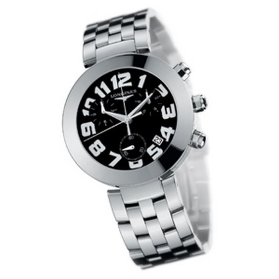 Orologio Longines Dolce Vita da uomo con movimento al quarzo cronografico Swiss Made, vetro zaffiro, quadrante nero con numerazioen araba e datario tra le 4 e le 5, bracciale in acciaio con chisuura deployante