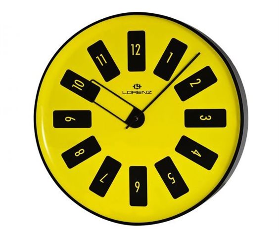 Orologio da parete Lorenz con quadrante giallo e cassa in metallo nera