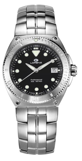 Orologio da donna Lorenz Aquitania al quarzo Swiss Made, cassa in acciaio tonda lucida e satinata, quadrante nero con indici e lancette luminescenti, data a ore 3, corona e fondello a vite impermeabile 20atm, bracciale acciaio lucido e satinato con chiusura deployante dotata di chiusura di sicurezza