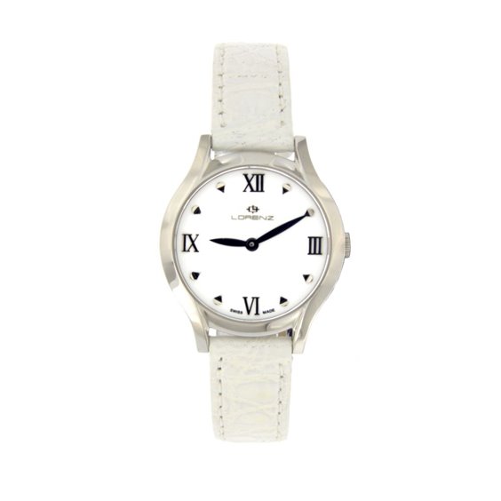 Orologio da donna Lorenz Blue Moon al quarzo Swiss Made, vetro in zaffiro, cassa in tonda in acciaio lucido, quadrante Bianco con numeri romani e indici, cinturino in coccodrillo bianco