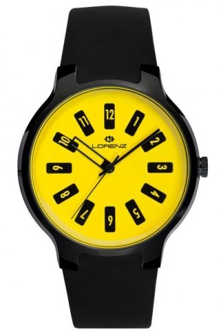 Orologio al quarzo, cassa in acciaio con trattamento IP nero lucido, diametro cassa mm 43. Impermeabile 5 atmosfere, fondello a pressione, vetro minerale, cinturino in silicone nero. Quadrante giallo con 12 finestrelle rettangolari che incorniciano i numeri arabi gialli su fondo nero, lancette smaltate.