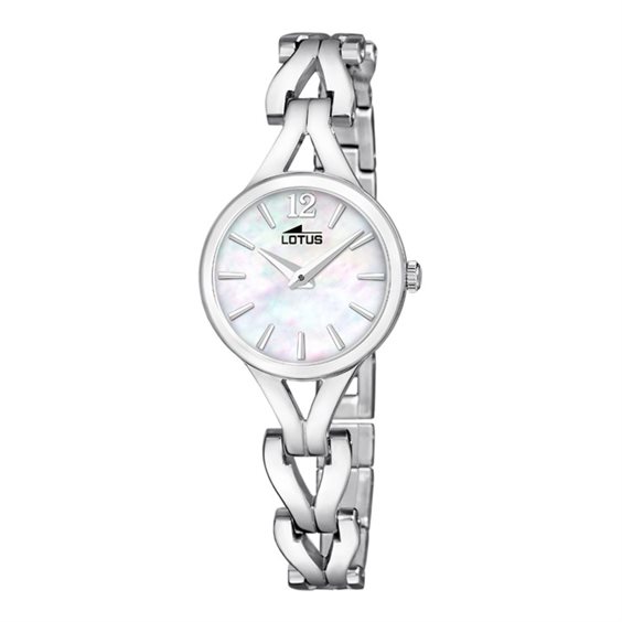 Orologio Lotus Old Money solo tempo al quarzo da donna. Diametro 26mm, spessore 7,5mm, peso 44gr. Vetro minerale, quadrante madreperla bianca, cassa acciaio 5atm, bracciale acciaio.