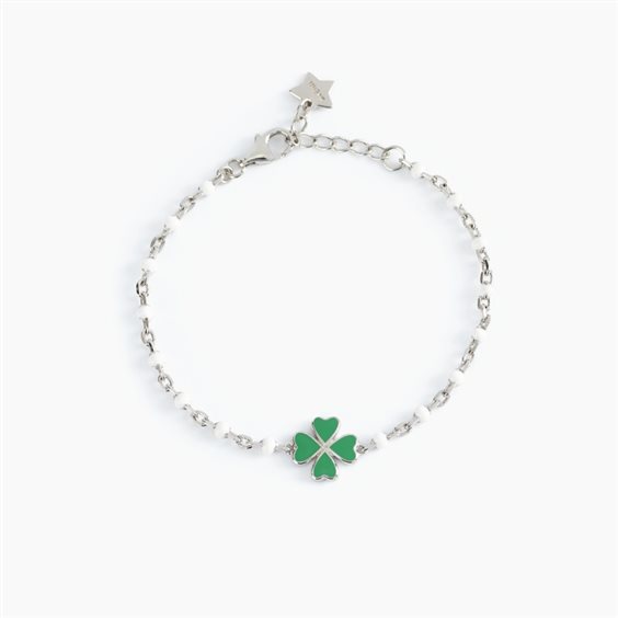 Bracciale in argento con ciondolo a forma di quadrifoglio smaltato verde e catena rolò con gocce in smalto bianco. • Dimensione del quadrifoglio: 10,1 x 9,9 mm • Chiusura con moschettone • Misura unica, lunghezza 16,5 cm • Materiale: Argento 925, Smalto