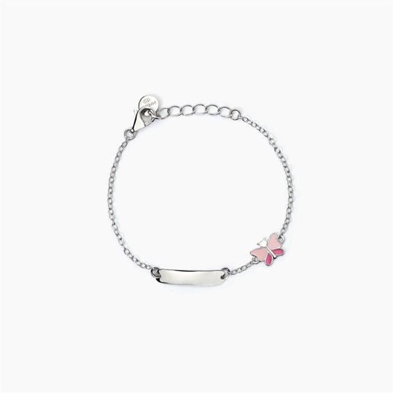 Bracciale in argento 925/°°° rodiato con catena forzatina 1.5 mm, piastra 17x4 mm ed elemento farfallina smaltato 9.5x5.5 mm, lunghezza regolabile da 12 a 14 cm