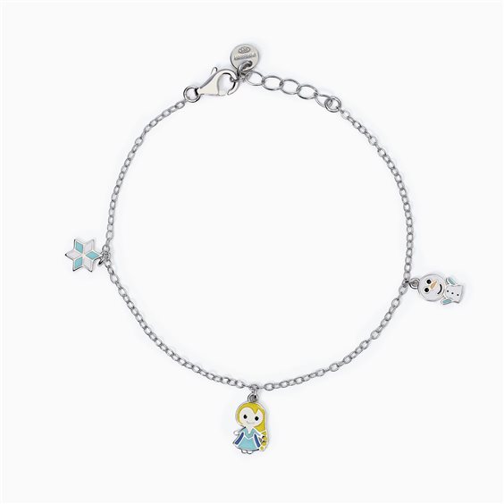 Bracciale regolabile da bambina in argento rodiato con catena forzatina e ciondoli smaltati a forma di fiocco di neve, bambina e pupazzo di neve.