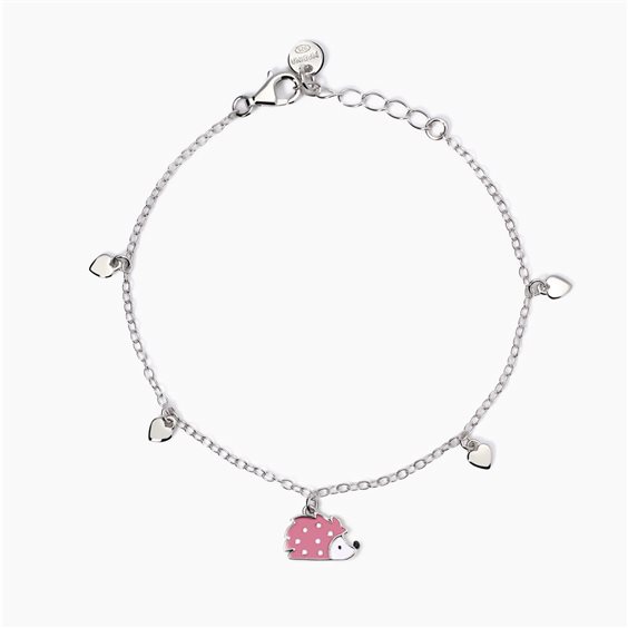 Bracciale in argento 925/ººº rodiato con catena forzatina 1.5 mm, charm cuoricino 3.5x3.5 mm e centrale riccio smaltato 10x6.5 mm, lunghezza regolabile da 14.5 a 16.5 cm