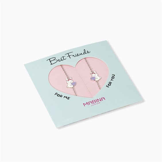 Set di due bracciali dedicato all'amicizia in argento rodiato con catena rolò e coniglietto centrale smaltato. • Dimensione catena: 1,5 mm • Dimensione coniglietto: 12,7x10 mm • Chiusura con moschettone • Misura regolabile, lunghezza da 14,5 a 16,5 cm • Materiale: Argento rodiato 925, Smalto