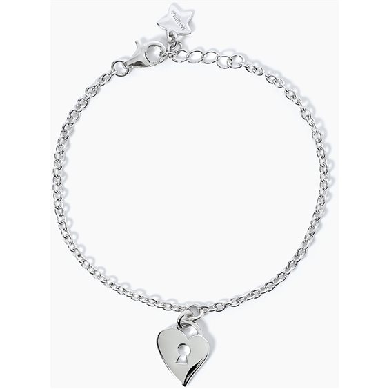 Bracciale di Mabina Gioielli da bambino della collezione Cuore Segreto. Bracciale in argento rodiato con ciondolo cuore lucchetto. Lunghezza regolabile da 14.5 a 16.5 cm. La referenza è: 533609