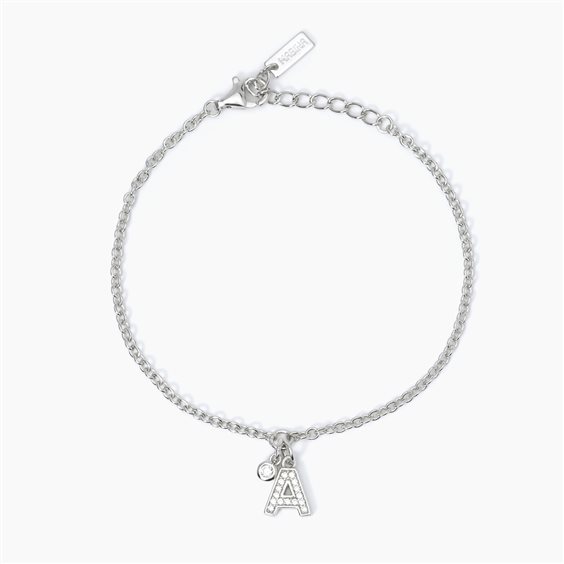 Bracciale in argento 925/°°° rodiato. Catena maglia rolò con pendente centrale "A" e punto luce cipollina. Misura regolabile da cm 15,5 a cm 18.