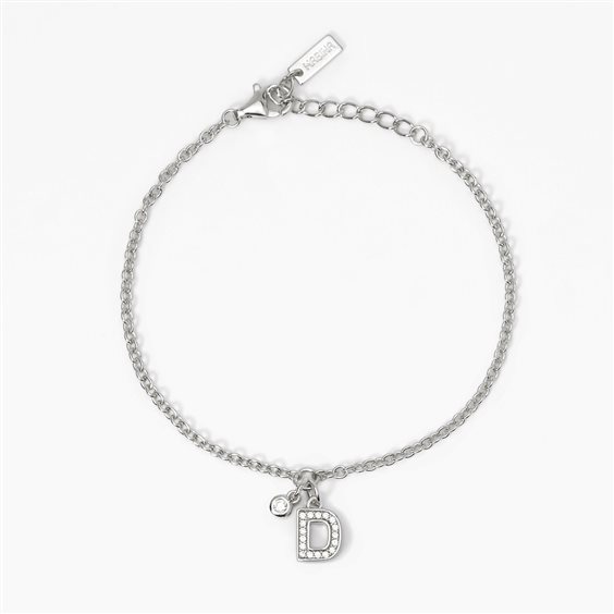 Bracciale in argento 925/°°° rodiato. Catena maglia rolò con pendente centrale "D" e punto luce cipollina. Misura regolabile da cm 15,5 a cm 18.