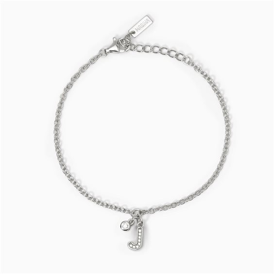 Bracciale in argento 925/°°° rodiato. Catena maglia rolò con pendente centrale "J" e punto luce cipollina. Misura regolabile da cm 15,5 a cm 18.