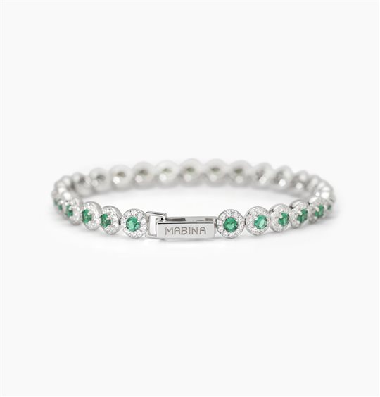Bracciale tennis in argento 925/°°° rodiato con smeraldi sintetici Ø 3 mm e zirconi bianchi Ø 1.25 mm, lunghezza 17 cm