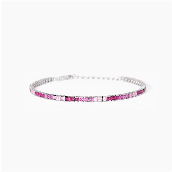 Bracciale tennis in argento 925/°°° rodiato con corindoni rosa sintetiche e zirconi rosa taglio Princess 2x2 mm, lunghezza regolabile da 16 a 19 cm