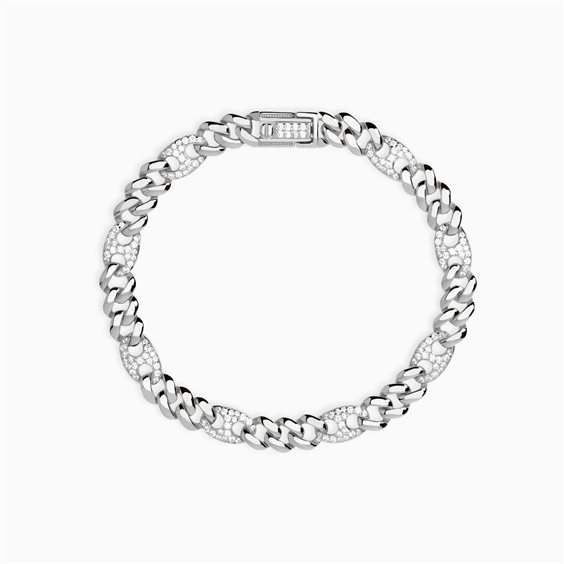 Bracciale in argento con catena groumette, maglie marine e zirconi. • Dimensione catena: 6,3 mm • Dimensione maglie marine: 10x6,3 mm • Diametro zirconi: 1 mm • Misura unica, lunghezza: 18 cm • Materiale: Argento rodiato 925, Zirconi
