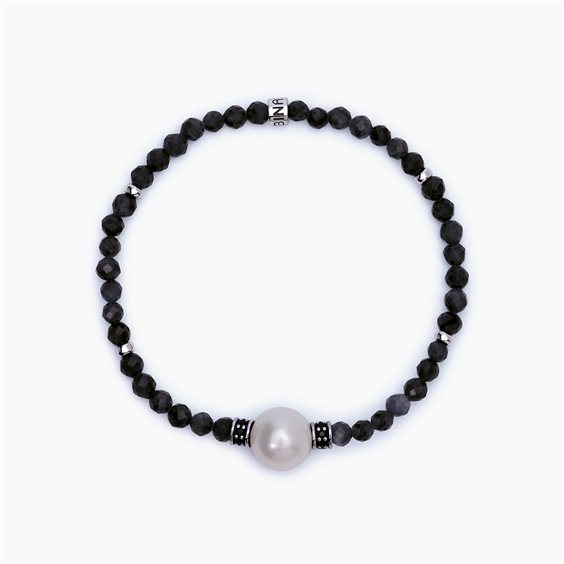 Bracciale uomo elastico in argento 925 rodiato, con sfere di Agata nera 4mm, perla coltivata grigia 11/12 mm e zirconi neri