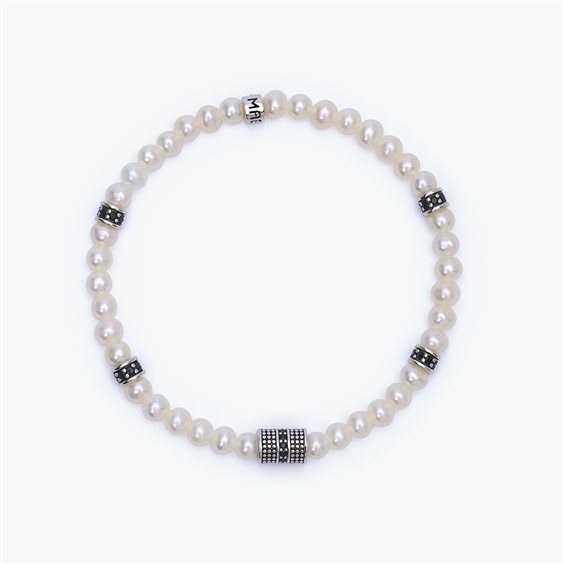 Bracciale in argento 925/°°° rodiato elastico con perle coltivate Ø 4.5/5 mm ed inserti con zirconi neri Ø 1.20 mm, lunghezza 19 cm.