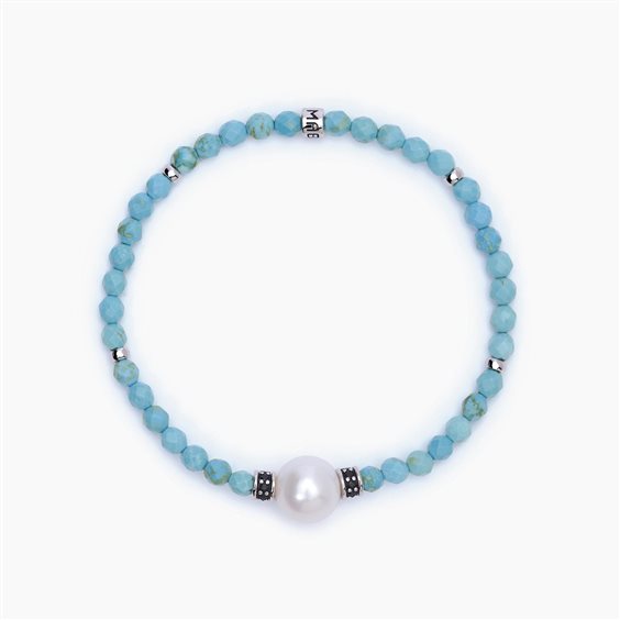 acciale da uomo in argento rodiato con turchese, perla bianca e inserti con zirconi neri. • Diametro turchese: 4 mm • Diametro perla: 11-12 mm • Diametro zirconi: 1,2 mm • Misura unica, lunghezza 19 cm • Materiale: Argento 925, Turchese, Perle coltivate, Zirconi