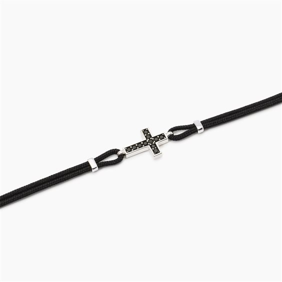 Bracciale in cordino in nylon e argento 925 rodiato. Croce centrale con zirconi neri. Chiusura a moschettone. Misura regolabile da cm 18,5 a cm 20.
