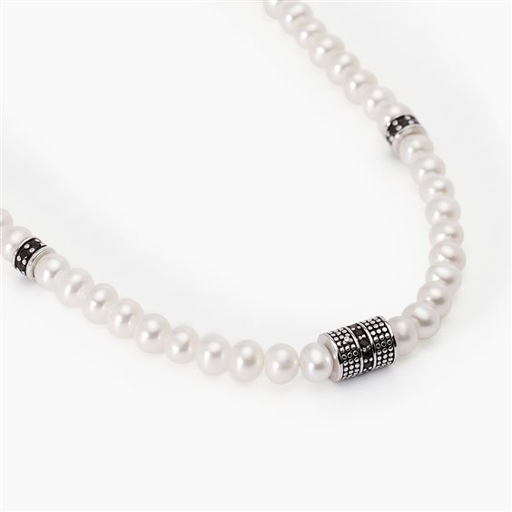 Girocollo uomo in argento 925 rodiato, perle coltivate bianche 4,5/5 mm , cilindro borchiato e zirconi neri. Lunghezza regolabile da 45 a 50 cm
