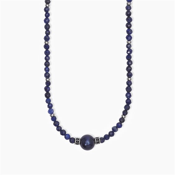 Girocollo uomo in argento 925 rodiato, sfere di Lapis 4mm, perla coltivata nera 11/12mm e zirconi neri. Lunghezza regolabile da 45 a 50 cm