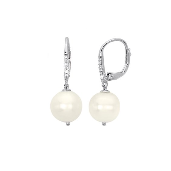 Orecchini in Argento 925/°°°, chiusura a monachella , lunghezza cm 2,5 , perle bianche coltivate , zirconi bianchi incastonati. Immagine indicativa , la confezione può cambiare di forma e colore , scatola e garanzia originali.