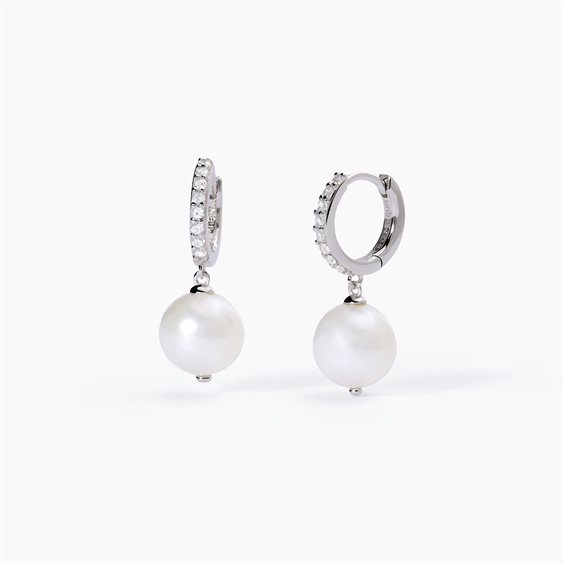 Orecchini in argento 925/°°° rodiato con perla coltivala Ø 10-11 mm e zirconi bianchi, diametro esterno 15 mm, lunghezza orecchino 2.5 cm.