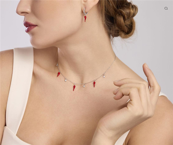 Orecchini in argento 925/°°° rodiato con pendenti cornetto smaltato 4.5x13.5 mm e zirconi Ø 1.5 mm, Ø cerchio esterno 12.5 mm, interno 8.5 mm, lunghezza totale orecchino 2.5 cm