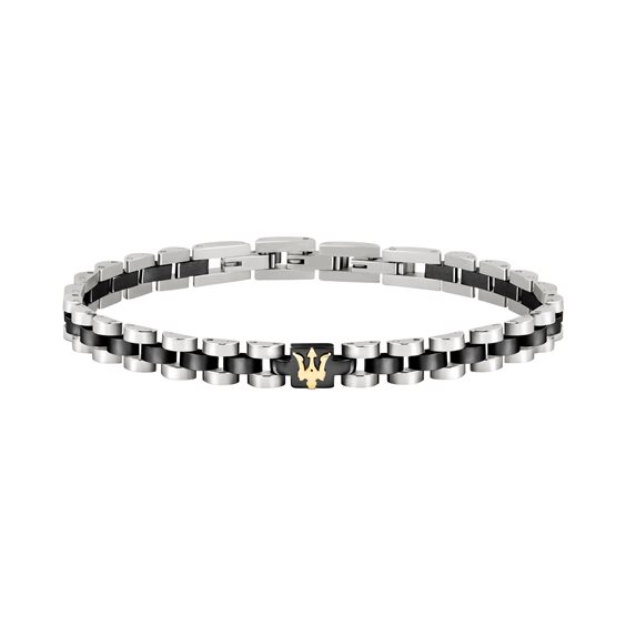 Braccialetto da uomo Maserati realizzato interamente in acciaio anallergico silver e nero. Centrale con trattamento ip nero e logo del brand con finitura color oro. Ha lunghezza totale di 21 cm; possibilità di rimuovere alcune maglie alla chiusura. .