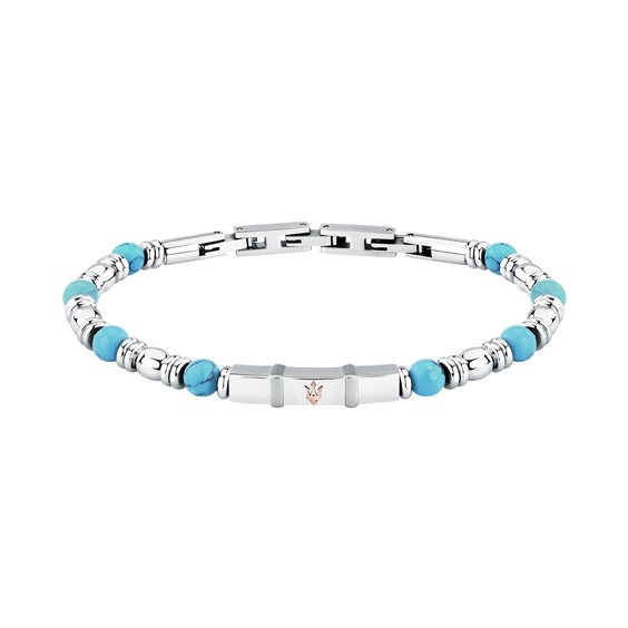 Braccialetto da uomo realizzato in acciaio anallergico e sfere in turchese. Elemento centrale con logo nero. Misura regolabile; chiusura con maglie rimovibili.