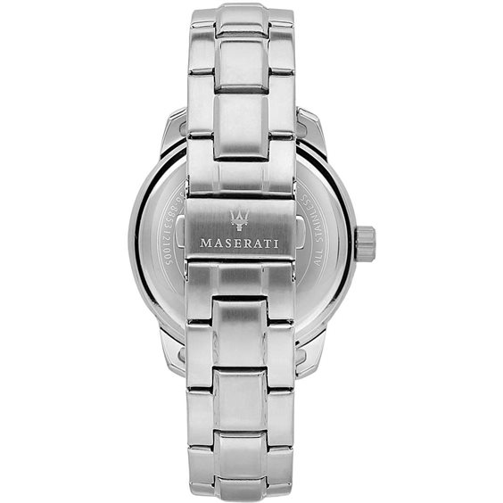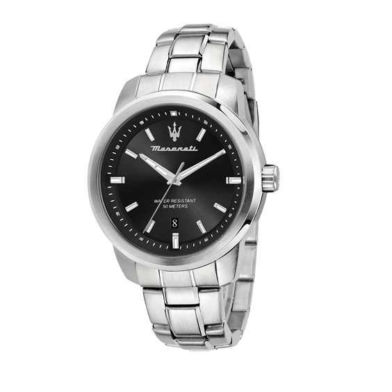 Orologio Solo Tempo Da Uomo Di Maserati Successo. Orologio Con Cassa Tonda In Acciaio Con Trattamento Lucido E Satinato Del Diametro Di 44Mm E Bracciale In Metallo Di Colore Argento. Modello Con Resistenza All'Acqua Di 5 Atm E Datario.