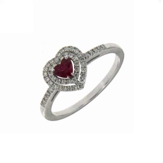 Anello Mirco Visconti con rubino rosso taglio cuore 0,47 birm. e doppio contorno di diamanti 0,19ct G Vs. La foto è indicativa del modello ma può non rispecchiare l'oggetto finito per numero di pietre e proporzioni legate alla caratura delle pietre.