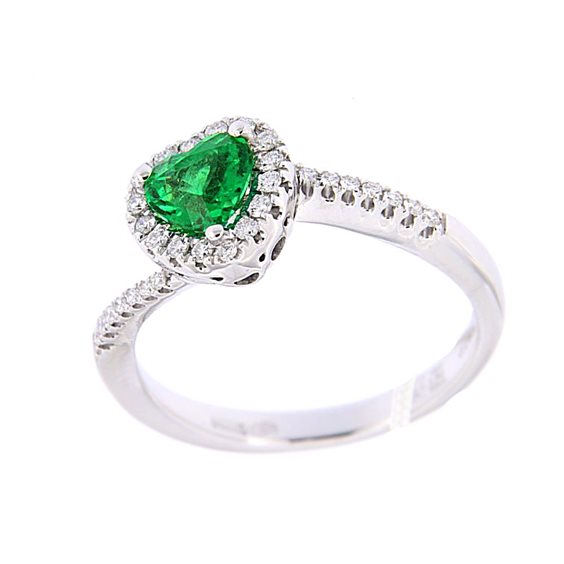 Anello a Forma di Cuore in Oro 18k Bianco con Smeraldo Taglio Cuore 0,70ct Colom e Diamanti 0,24ct G Vs come contorno e sul gambo
