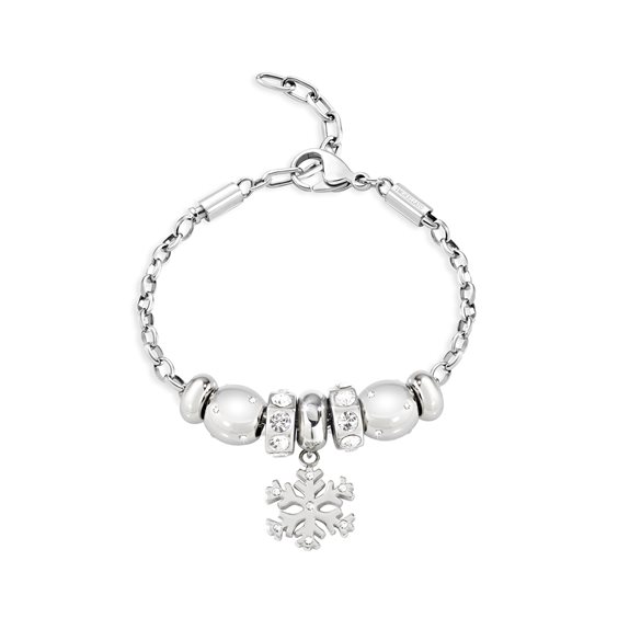 Bracciale in acciaio con charms tondi e fiocco di neve Dotato di catenella finale per regolare la lunghezza ed adattarsi ad ogni tipologia di polso