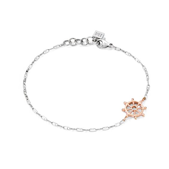 bracciale in acciaio con dettaglio in acciaio rosato a forma di timone dotato di catenella finale per regolare la vestibilità su ogni misura di polso