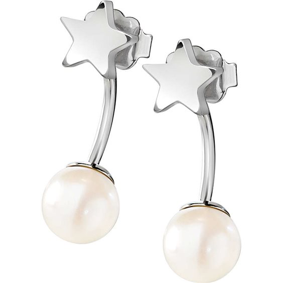 Orecchini in acciaio lucido leggermente pendenti rigidi con perla bianca naturale. Paletto e farfallina in acciao lucido.