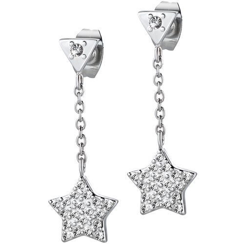 Orecchini donna in acciaio 316L , pendente cm 2,8 , terminale con stella , zirconi bianchi. Immagine indicativa , la confezione può variare in forma e colore.
