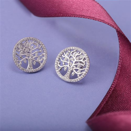Orecchini donna , argento 925% rodiato , diametro cm 1,5 , albero della vita con zirconi bianchi incastonati. Immagine indicativa , la confezione può variare di forma e colore.