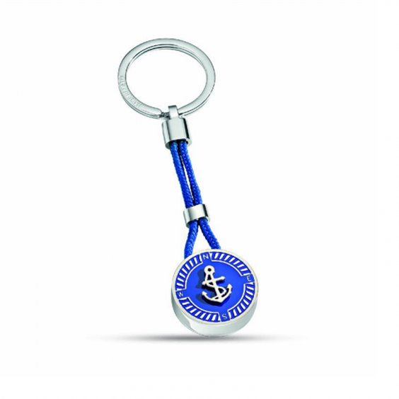 Portachiavi in acciaio 316L , lunghezza cm 11 , smalto blu , anello , cordino nautico blu. Immagine indicativa , la confezione può variare di forma e colore.