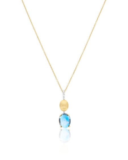 Raffinato pendente in oro 18kt e diamanti coronato da un elegante boule in topazio London blu. 42,5cm