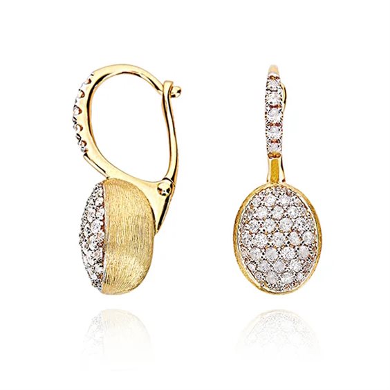 Due "ciliegine" in diamanti abbracciate dall’oro 18kt inciso a mano, capolavoro di artigianato artistico e di creatività. Misura orecchino: 8,2 mm x 21,20 mm