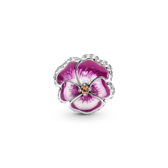 Viola del Pensiero Rosa Argento Sterling 925; 2 cristalli arancione scuro, incastonatura a griffe, taglio brillante; 12 micro zirconia cubica incolore e 44 zirconia cubica incolore, incastonatura a granette, taglio brillante; smalto radiant